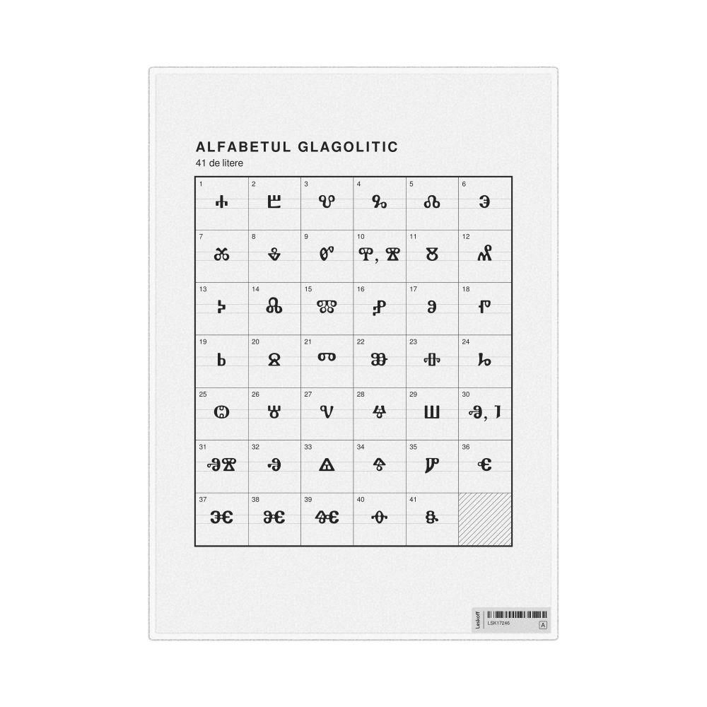 The Glagolitic alphabet chart (the full set of letters) labeled in Romanian (Alfabetul glagolitic) in the 8.3 x 11.7 in (21.0 x 29.7 cm, desk chart, laminated) format.
