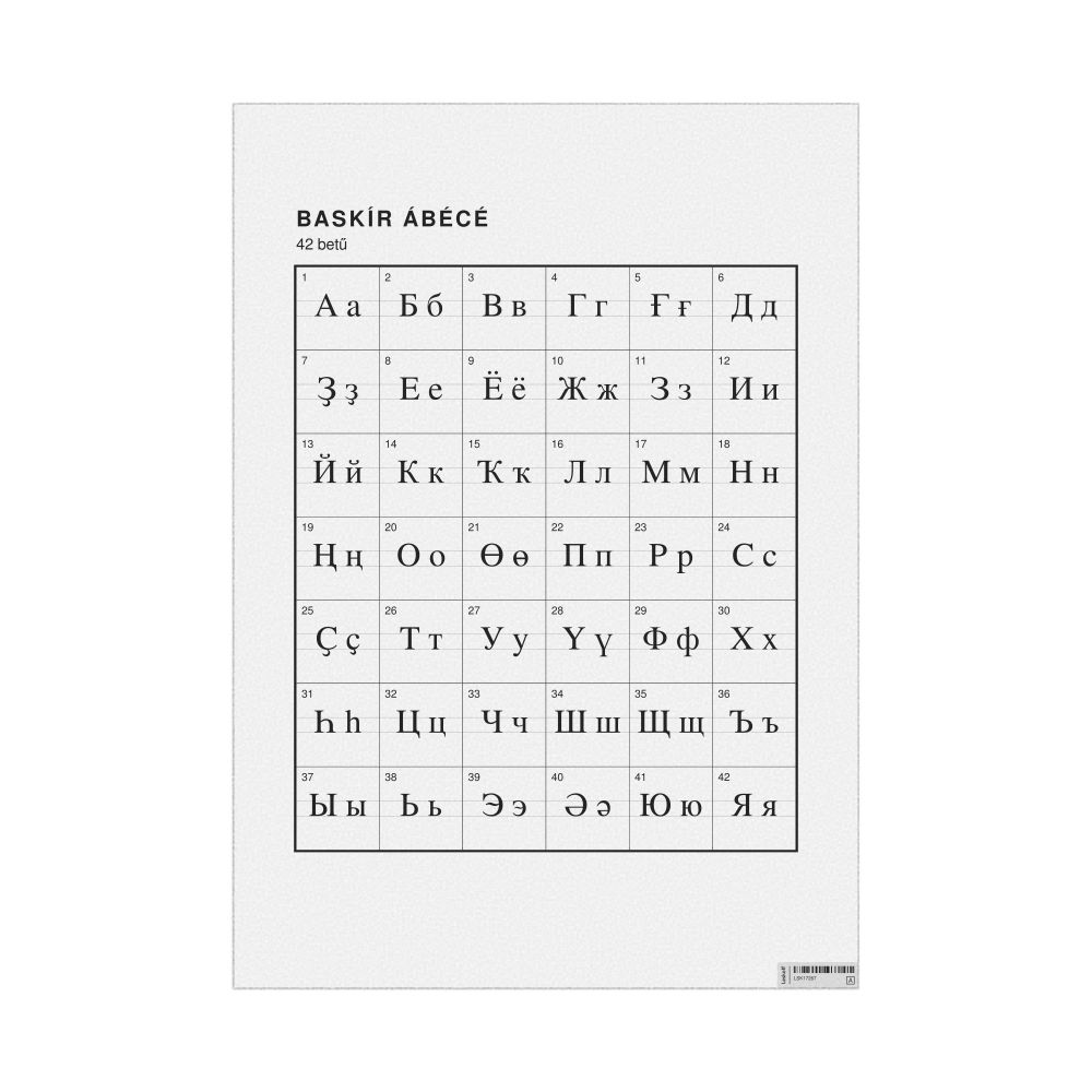 The Bashkir alphabet chart (the full set of letters) labeled in Hungarian (Baskír ábécé) in the 23.4 x 33.1 in (59.4 x 84.1 cm, poster / wall chart) format.