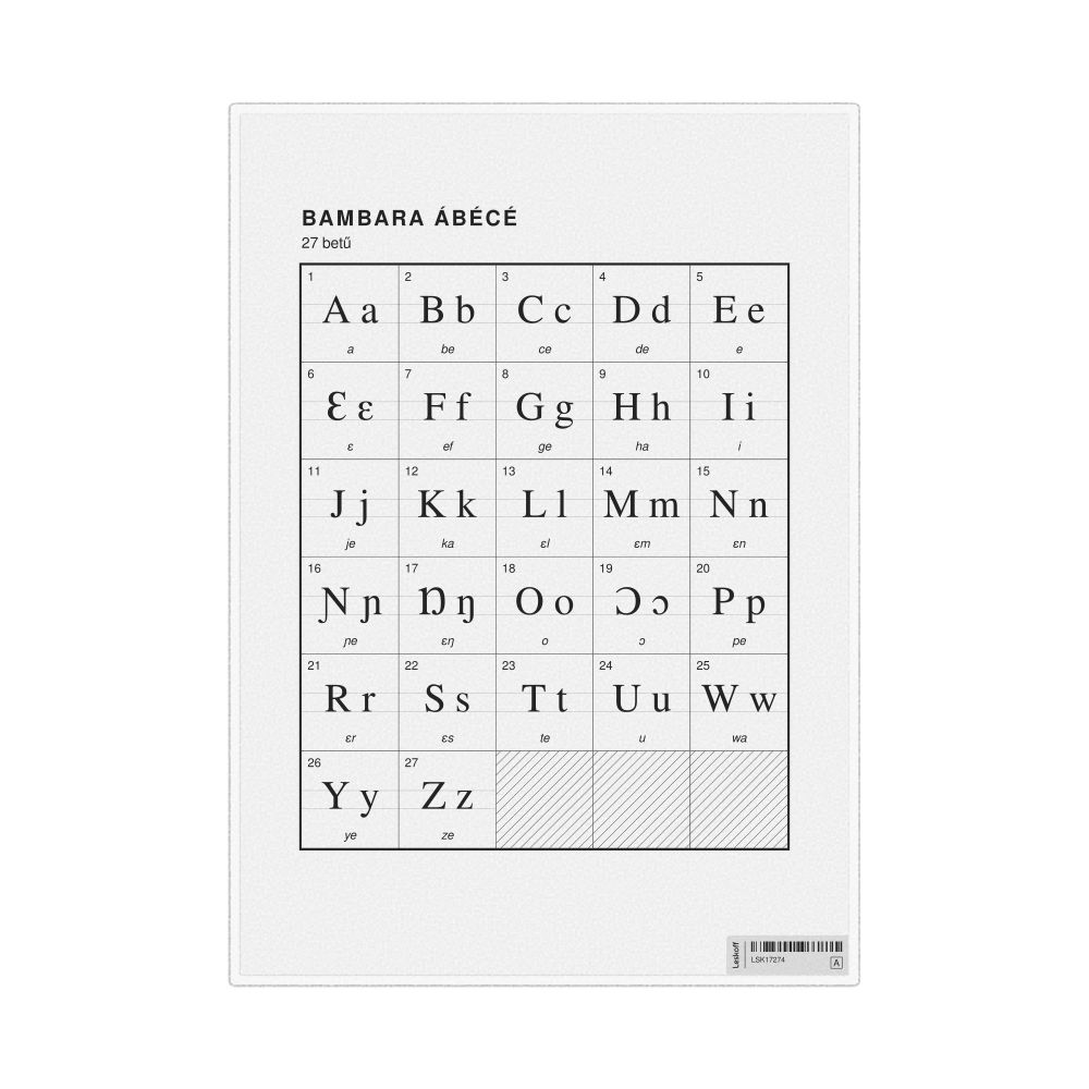 The Bambara alphabet chart (the full set of letters) labeled in Hungarian (Bambara ábécé) in the 8.3 x 11.7 in (21.0 x 29.7 cm, desk chart, laminated) format.