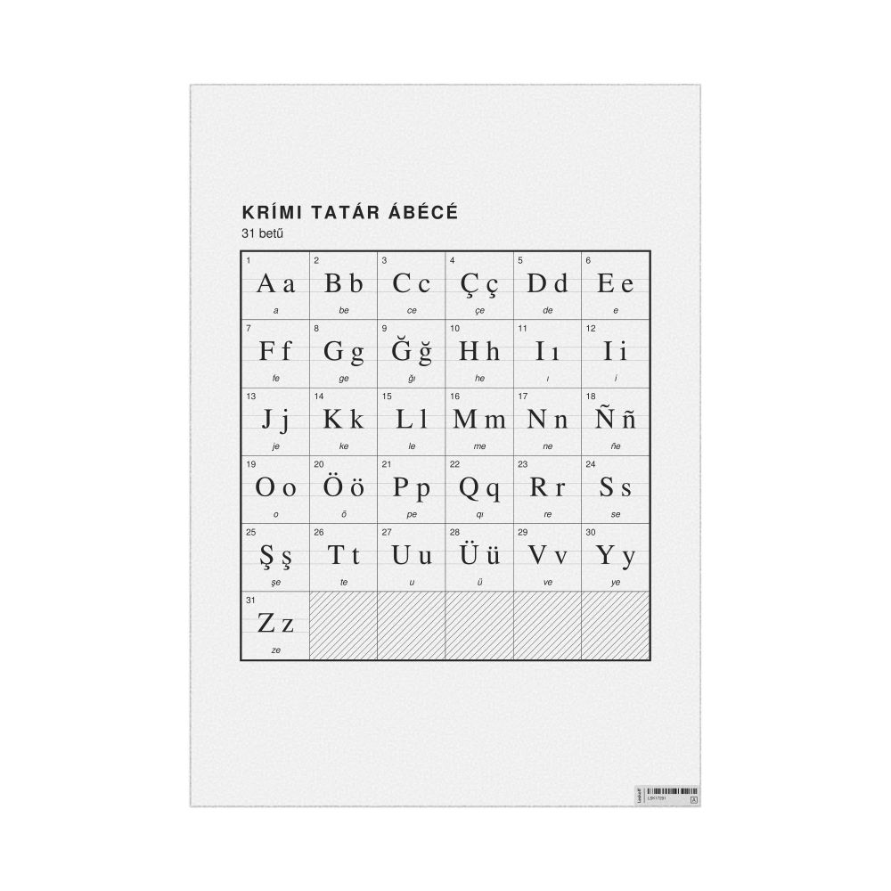 - Linguists and philologists - For both professionals and hobbyists, this alphabet print serves as a piece of linguistic art that presents the character inventory of Crimean Tatar as a linguistic (graphemic) dataset. Add this to your Crimean Tatar collection to complement your studies and research. A mixture of Crimean Tatar letters and Hungarian metatext makes it a unique, visually intriguing illustration of linguistic diversity and interaction.