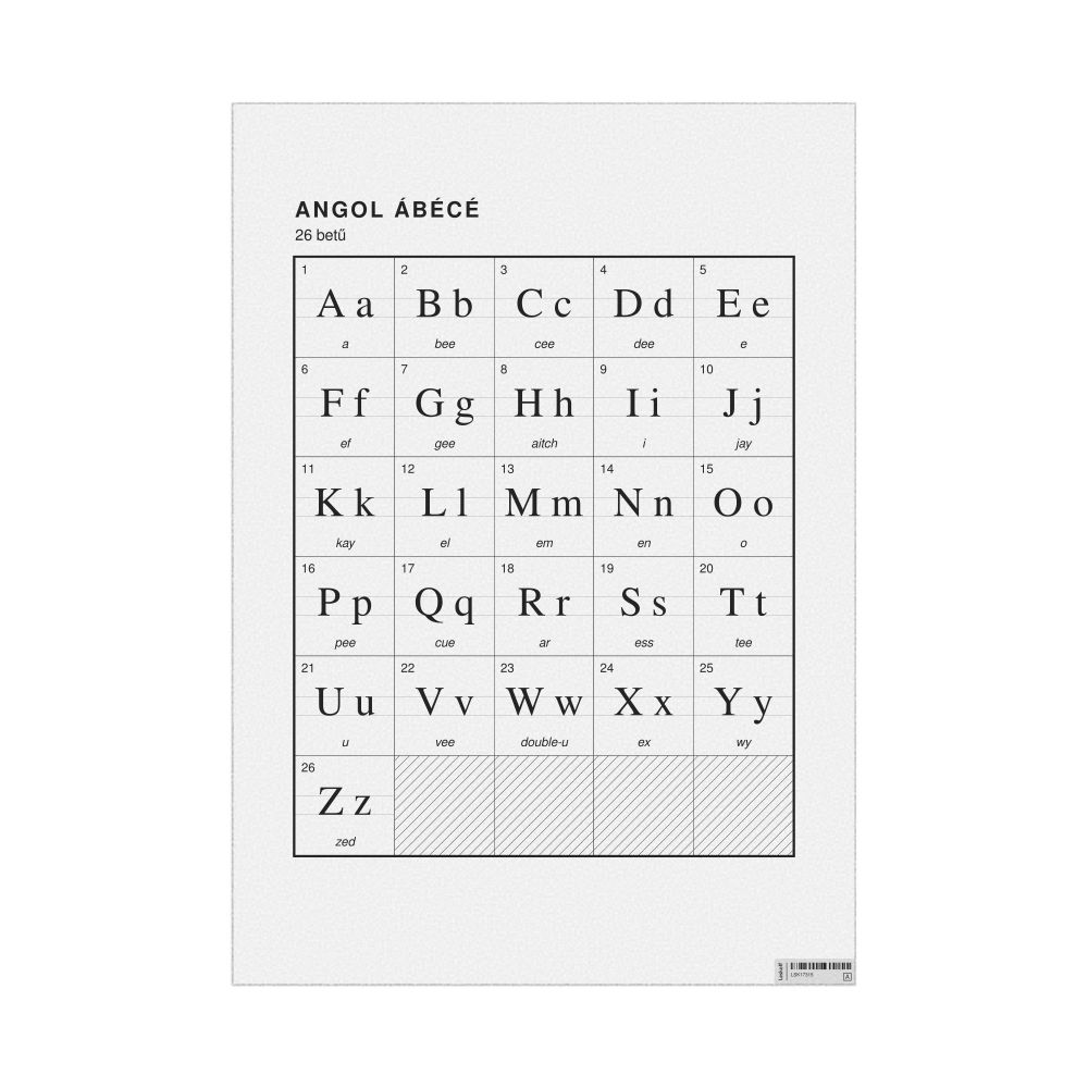 The English alphabet chart (the full set of letters) labeled in Hungarian (Angol ábécé) in the 23.4 x 33.1 in (59.4 x 84.1 cm, poster / wall chart) format.