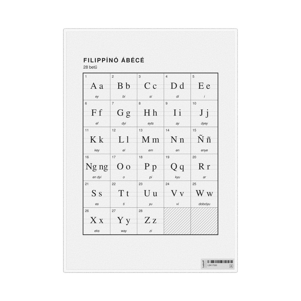 The Filipino alphabet chart (the full set of letters) labeled in Hungarian (Filippínó ábécé) in the 8.3 x 11.7 in (21.0 x 29.7 cm, desk chart, laminated) format.