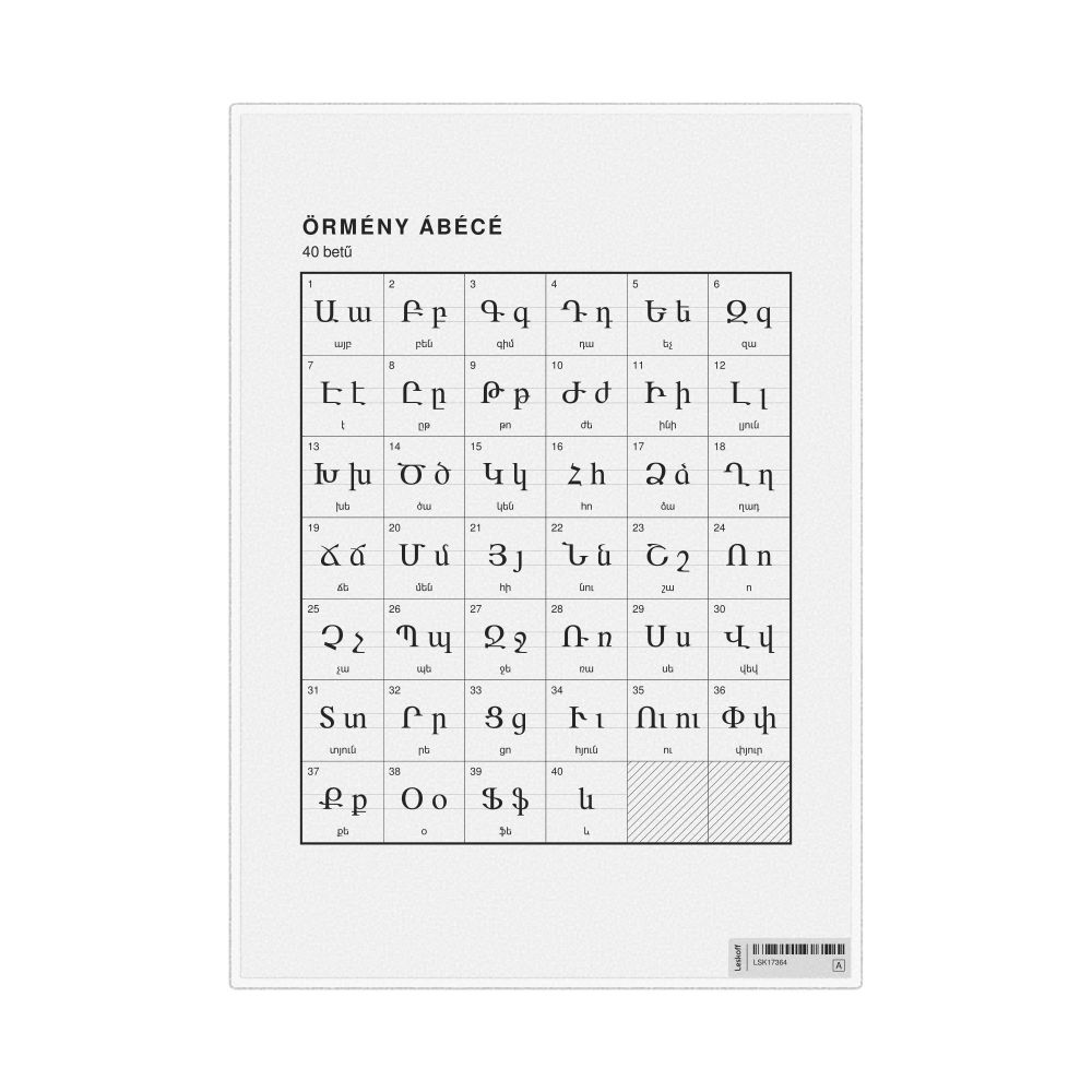 The Armenian alphabet chart (the full set of letters) labeled in Hungarian (Örmény ábécé) in the 8.3 x 11.7 in (21.0 x 29.7 cm, desk chart, laminated) format.