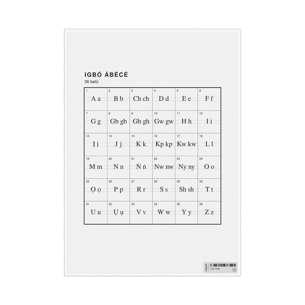 The Igbo alphabet chart (the full set of letters) labeled in Hungarian (Igbó ábécé) in the 8.3 x 11.7 in (21.0 x 29.7 cm, desk chart, laminated) format.