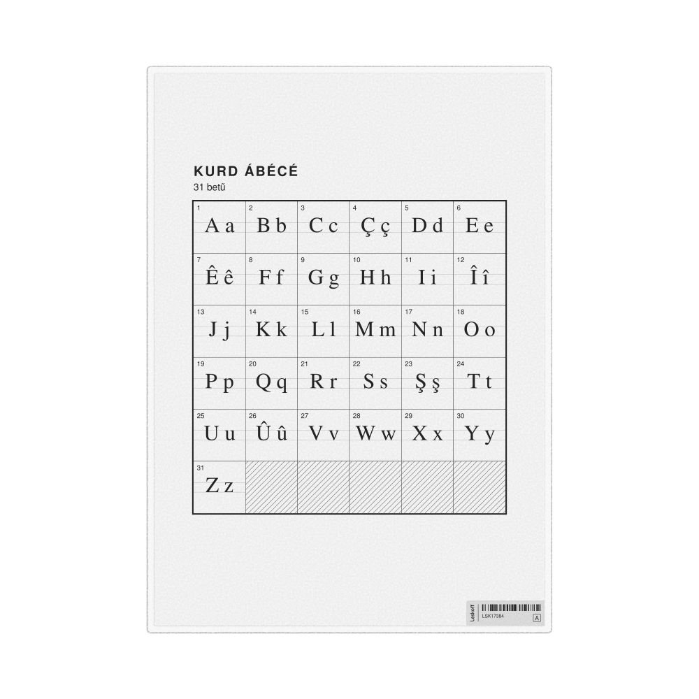 The Kurdish alphabet chart (the full set of letters) labeled in Hungarian (Kurd ábécé) in the 8.3 x 11.7 in (21.0 x 29.7 cm, desk chart, laminated) format.