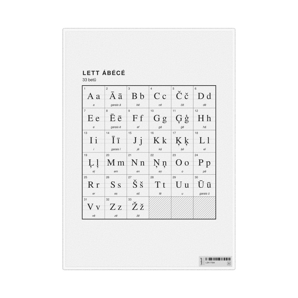 The Latvian alphabet chart (the full set of letters) labeled in Hungarian (Lett ábécé) in the 8.3 x 11.7 in (21.0 x 29.7 cm, desk chart, laminated) format.