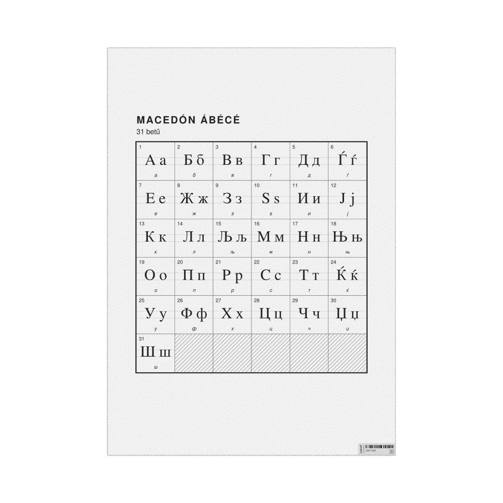 The Macedonian alphabet chart (the full set of letters) labeled in Hungarian (Macedón ábécé) in the 23.4 x 33.1 in (59.4 x 84.1 cm, poster / wall chart) format.