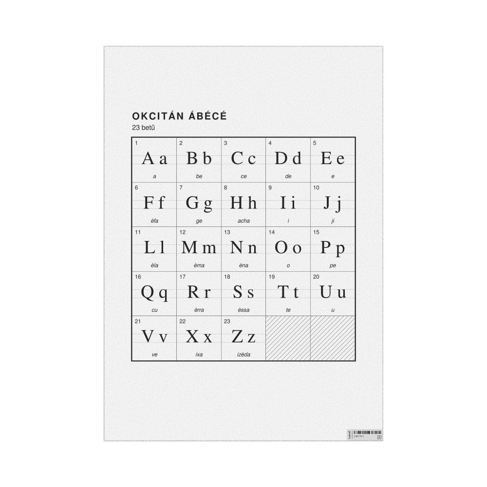 The Occitan alphabet chart (the full set of letters) labeled in Hungarian (Okcitán ábécé) in the 23.4 x 33.1 in (59.4 x 84.1 cm, poster / wall chart) format.