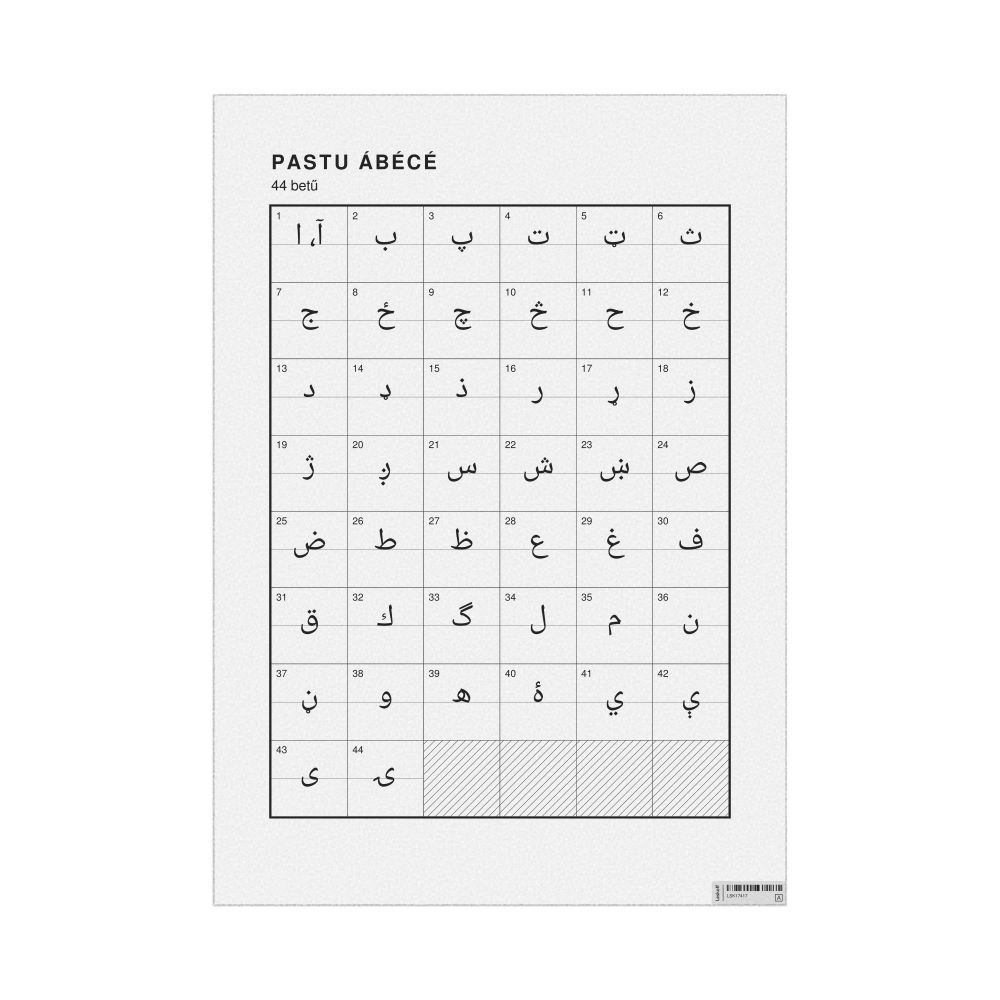 The Pashto alphabet chart (the full set of letters) labeled in Hungarian (Pastu ábécé) in the 23.4 x 33.1 in (59.4 x 84.1 cm, poster / wall chart) format.