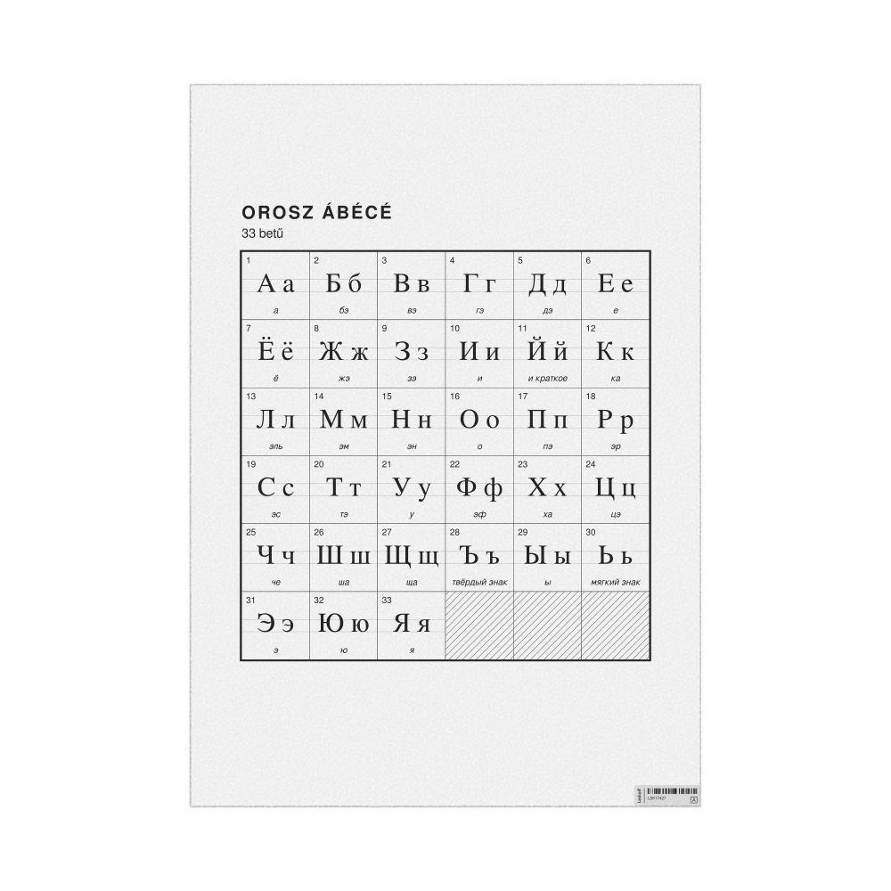 The Russian alphabet chart (the full set of letters) labeled in Hungarian (Orosz ábécé) in the 23.4 x 33.1 in (59.4 x 84.1 cm, poster / wall chart) format.