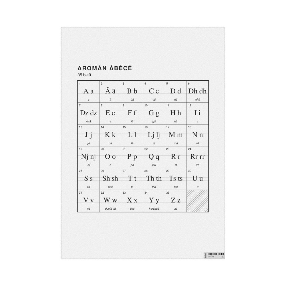 The Aromanian alphabet chart (the full set of letters) labeled in Hungarian (Aromán ábécé) in the 23.4 x 33.1 in (59.4 x 84.1 cm, poster / wall chart) format.