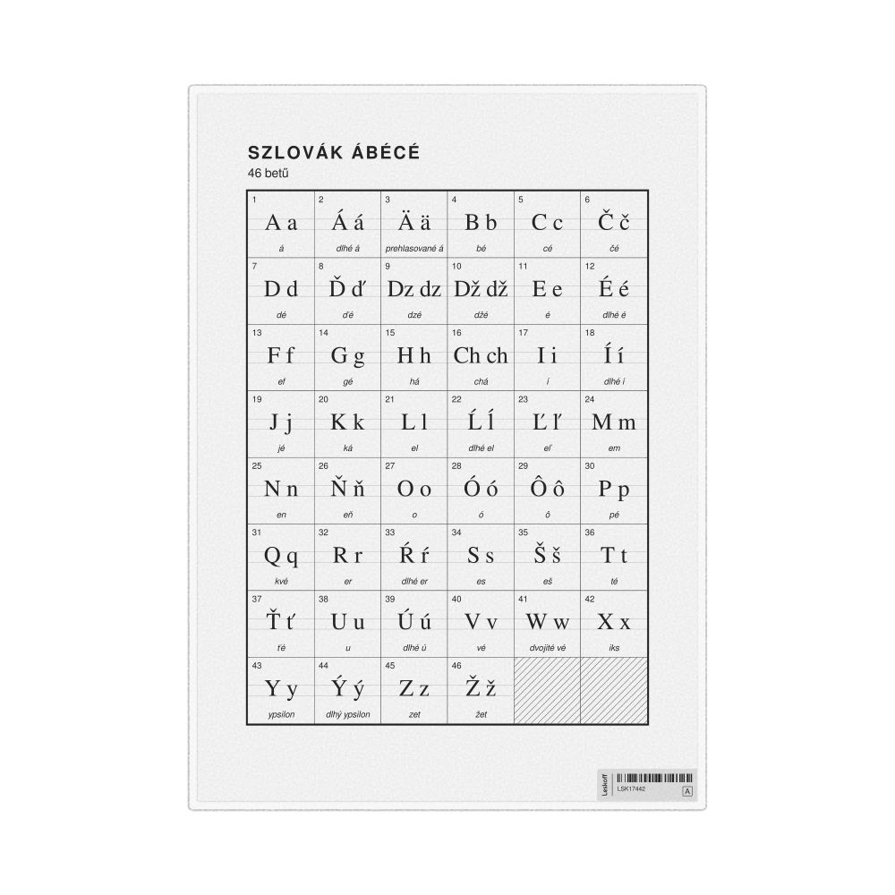 The Slovak alphabet chart (the full set of letters) labeled in Hungarian (Szlovák ábécé) in the 8.3 x 11.7 in (21.0 x 29.7 cm, desk chart, laminated) format.