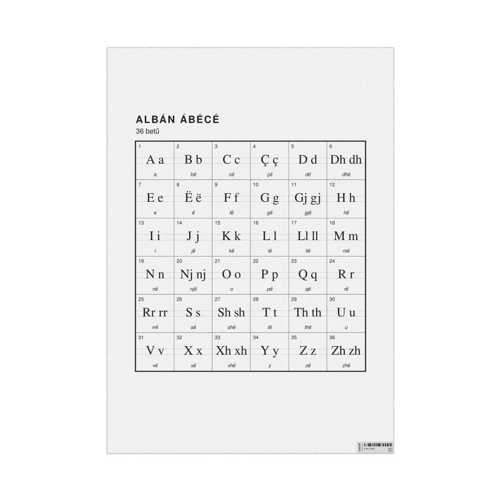 The Albanian alphabet chart (the full set of letters) labeled in Hungarian (Albán ábécé) in the 23.4 x 33.1 in (59.4 x 84.1 cm, poster / wall chart) format.