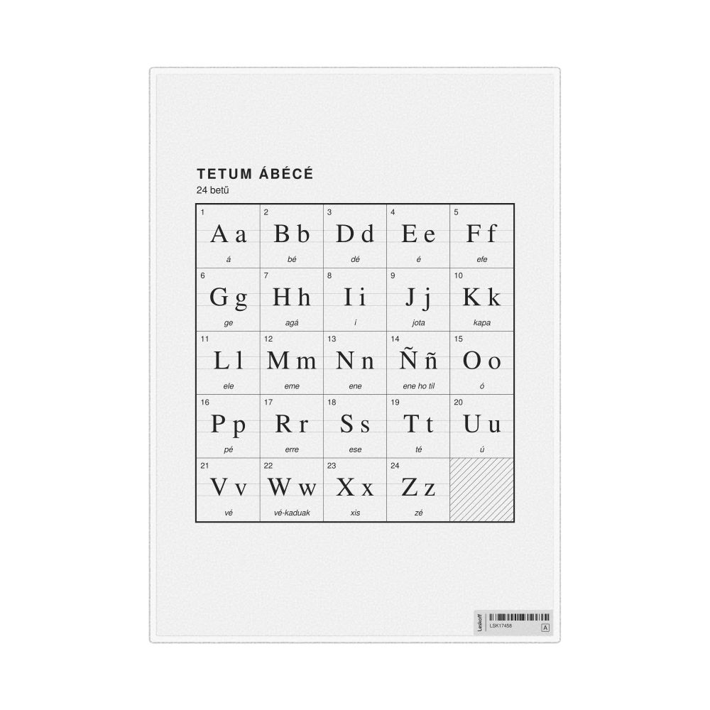The Tetum alphabet chart (the full set of letters) labeled in Hungarian (Tetum ábécé) in the 8.3 x 11.7 in (21.0 x 29.7 cm, desk chart, laminated) format.