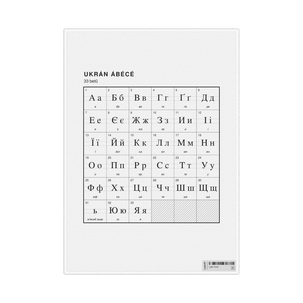 The Ukrainian alphabet chart (the full set of letters) labeled in Hungarian (Ukrán ábécé) in the 8.3 x 11.7 in (21.0 x 29.7 cm, desk chart, laminated) format.
