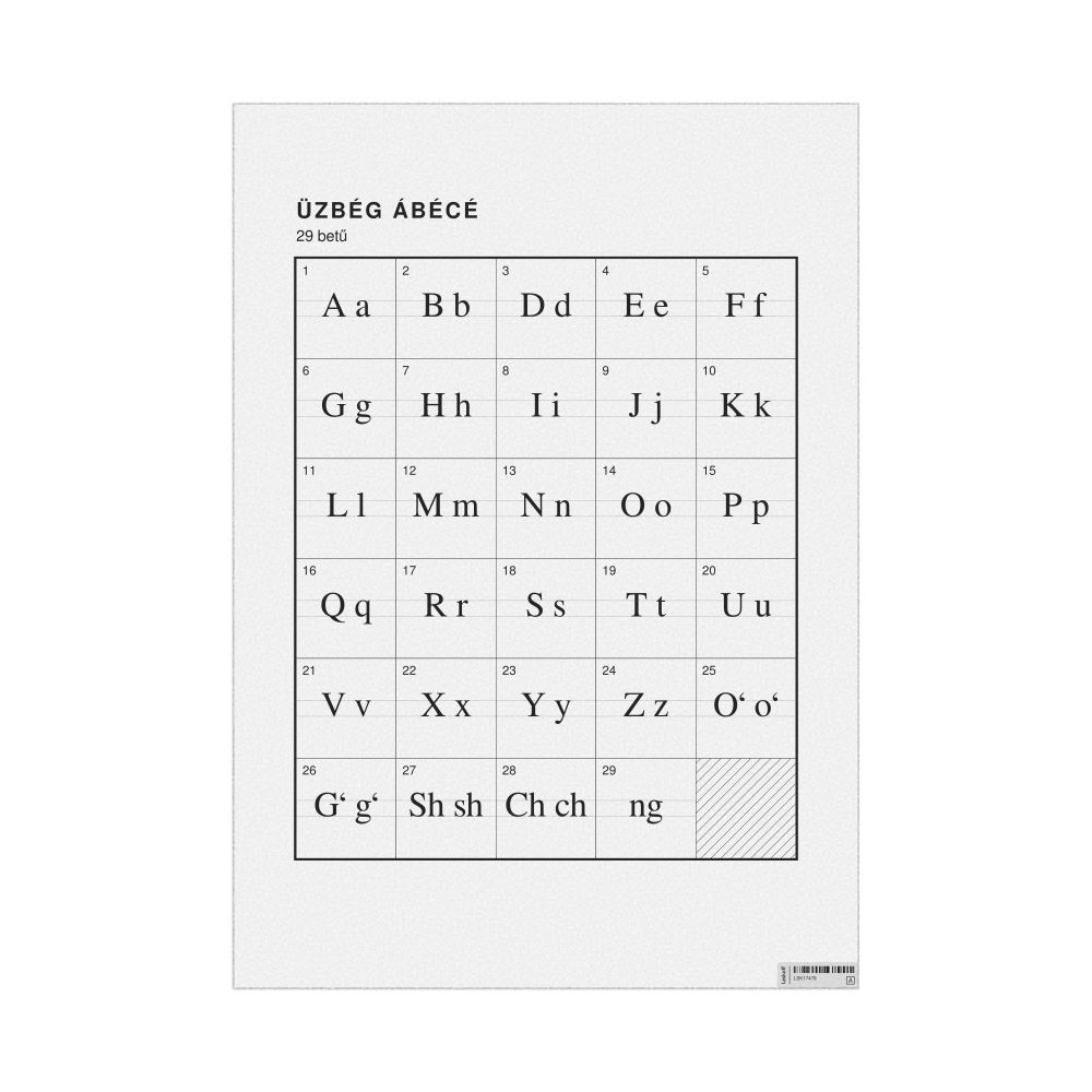 The Uzbek alphabet chart (the full set of letters) labeled in Hungarian (Üzbég ábécé) in the 23.4 x 33.1 in (59.4 x 84.1 cm, poster / wall chart) format.