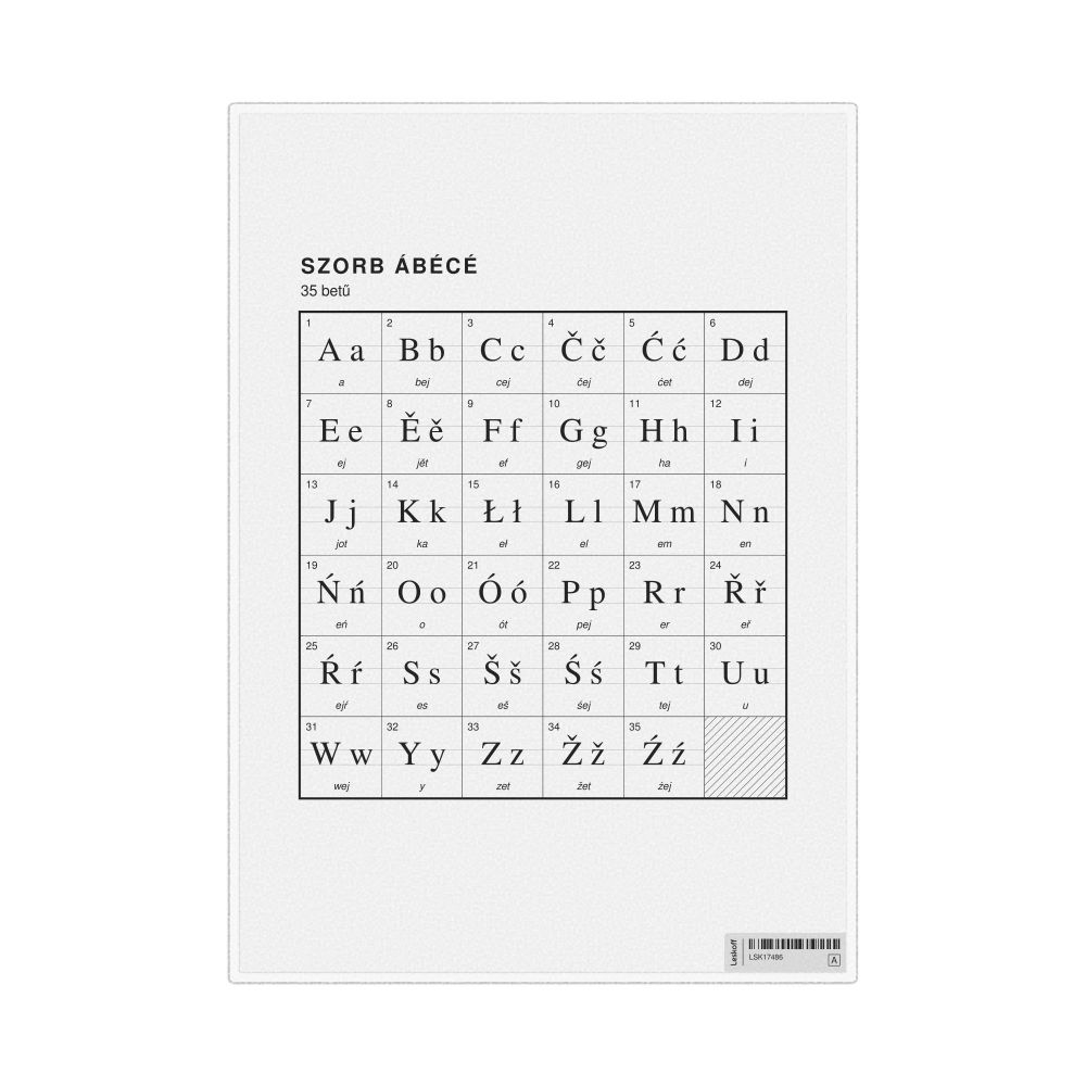 The Sorbian alphabet chart (the full set of letters) labeled in Hungarian (Szorb ábécé) in the 8.3 x 11.7 in (21.0 x 29.7 cm, desk chart, laminated) format.