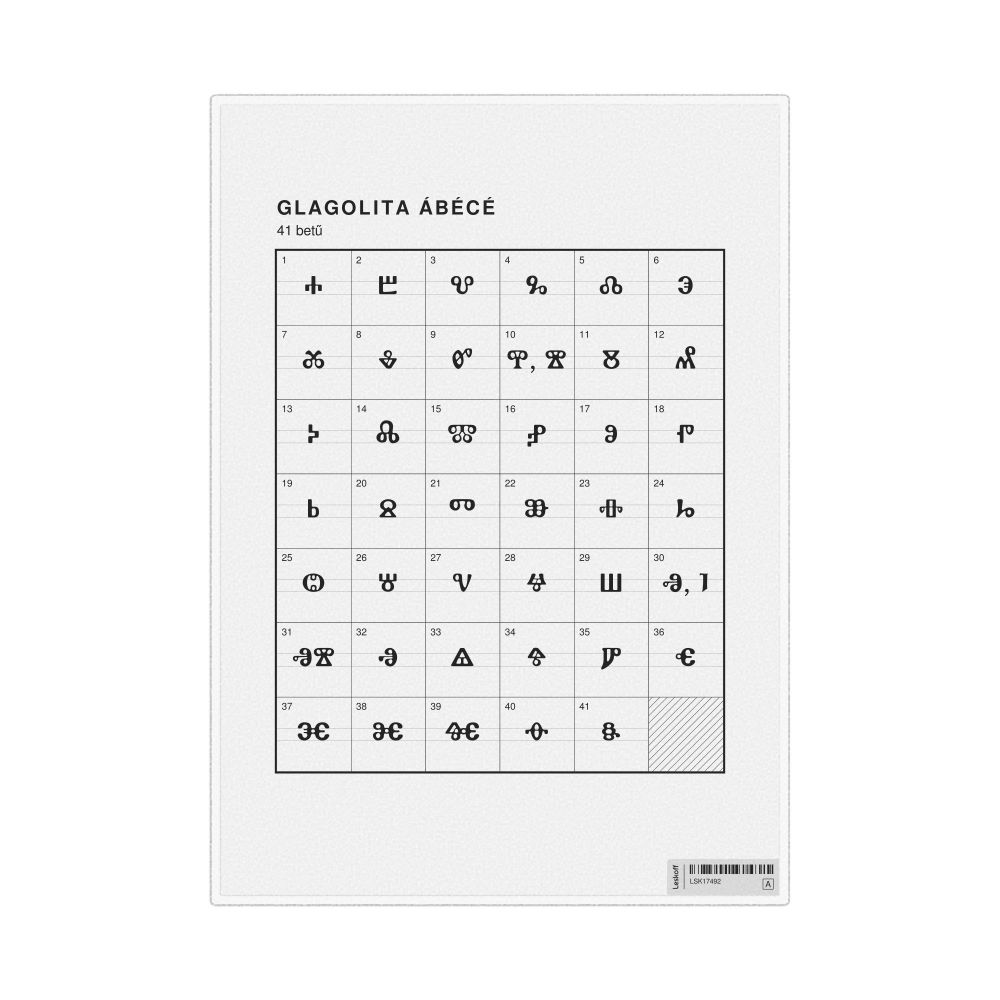 The Glagolitic alphabet chart (the full set of letters) labeled in Hungarian (Glagolita ábécé) in the 8.3 x 11.7 in (21.0 x 29.7 cm, desk chart, laminated) format.