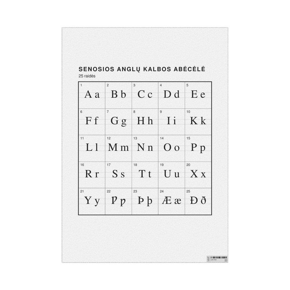 The Old English alphabet chart (the full set of letters) labeled in Lithuanian (Senosios anglų kalbos abėcėlė) in the 23.4 x 33.1 in (59.4 x 84.1 cm, poster / wall chart) format.