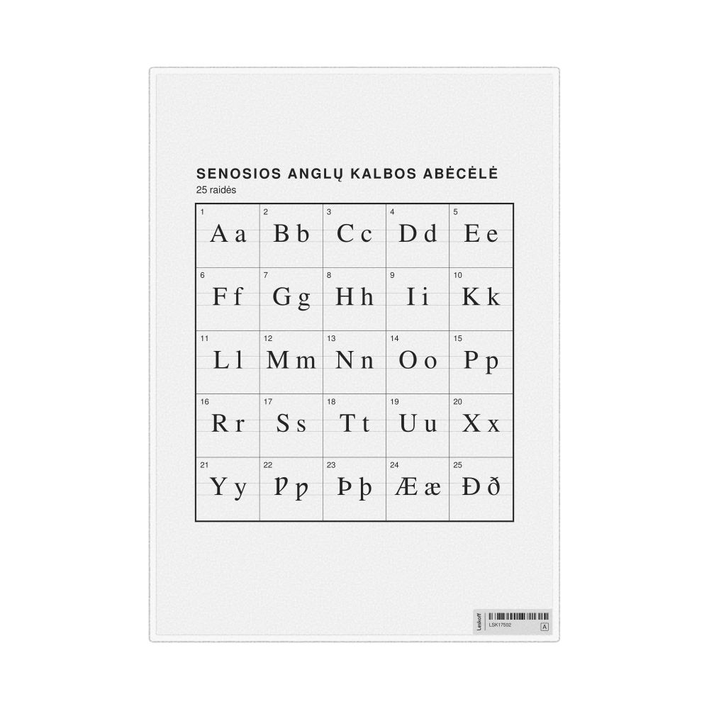 The Old English alphabet chart (the full set of letters) labeled in Lithuanian (Senosios anglų kalbos abėcėlė) in the 8.3 x 11.7 in (21.0 x 29.7 cm, desk chart, laminated) format.