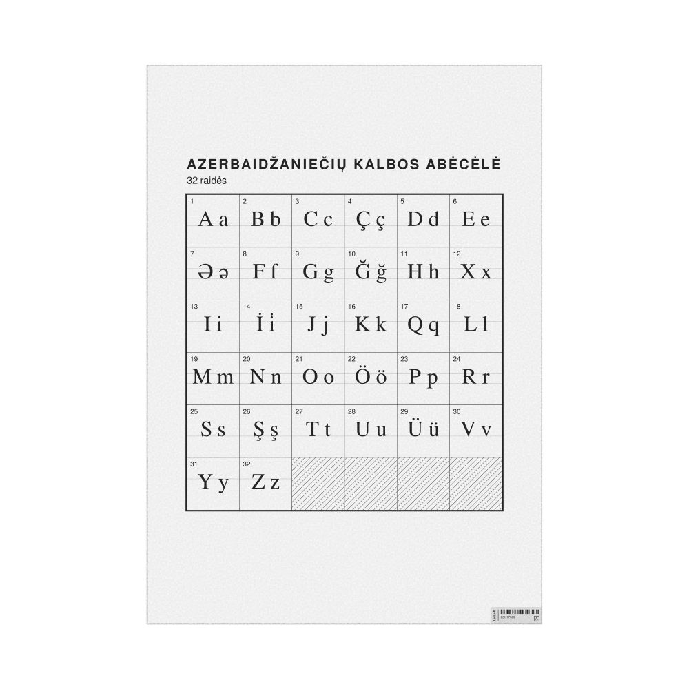 The Azerbaijani alphabet chart (the full set of letters) labeled in Lithuanian (Azerbaidžaniečių kalbos abėcėlė) in the 23.4 x 33.1 in (59.4 x 84.1 cm, poster / wall chart) format.
