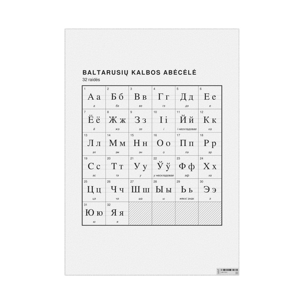 The Belarusian alphabet chart (the full set of letters) labeled in Lithuanian (Baltarusių kalbos abėcėlė) in the 23.4 x 33.1 in (59.4 x 84.1 cm, poster / wall chart) format.