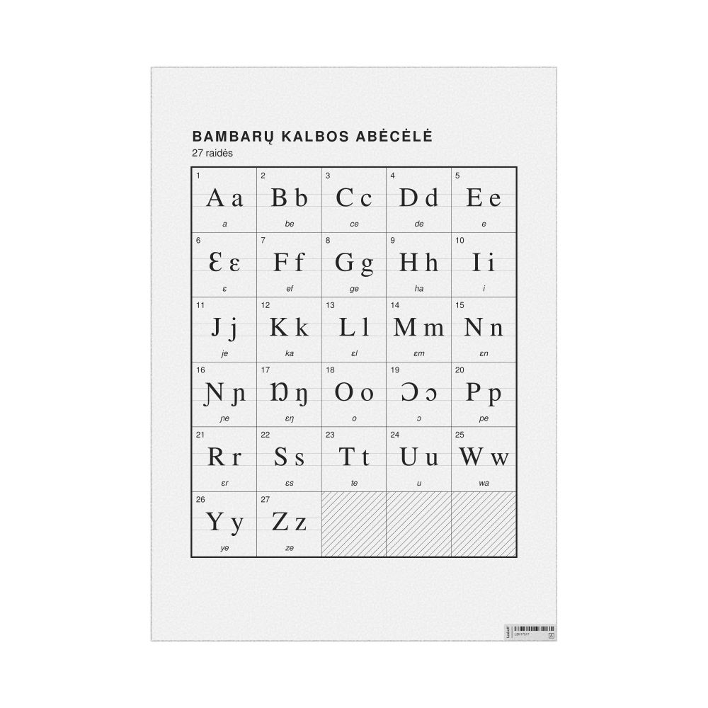 The Bambara alphabet chart (the full set of letters) labeled in Lithuanian (Bambarų kalbos abėcėlė) in the 23.4 x 33.1 in (59.4 x 84.1 cm, poster / wall chart) format.