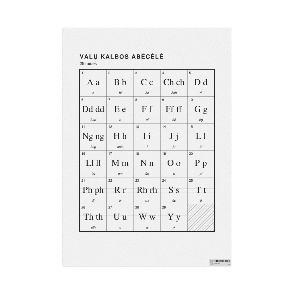 The Welsh alphabet chart (the full set of letters) labeled in Lithuanian (Valų kalbos abėcėlė) in the 23.4 x 33.1 in (59.4 x 84.1 cm, poster / wall chart) format.