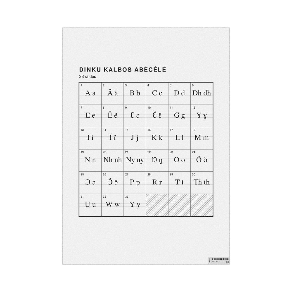 The Dinka alphabet chart (the full set of letters) labeled in Lithuanian (Dinkų kalbos abėcėlė) in the 23.4 x 33.1 in (59.4 x 84.1 cm, poster / wall chart) format.