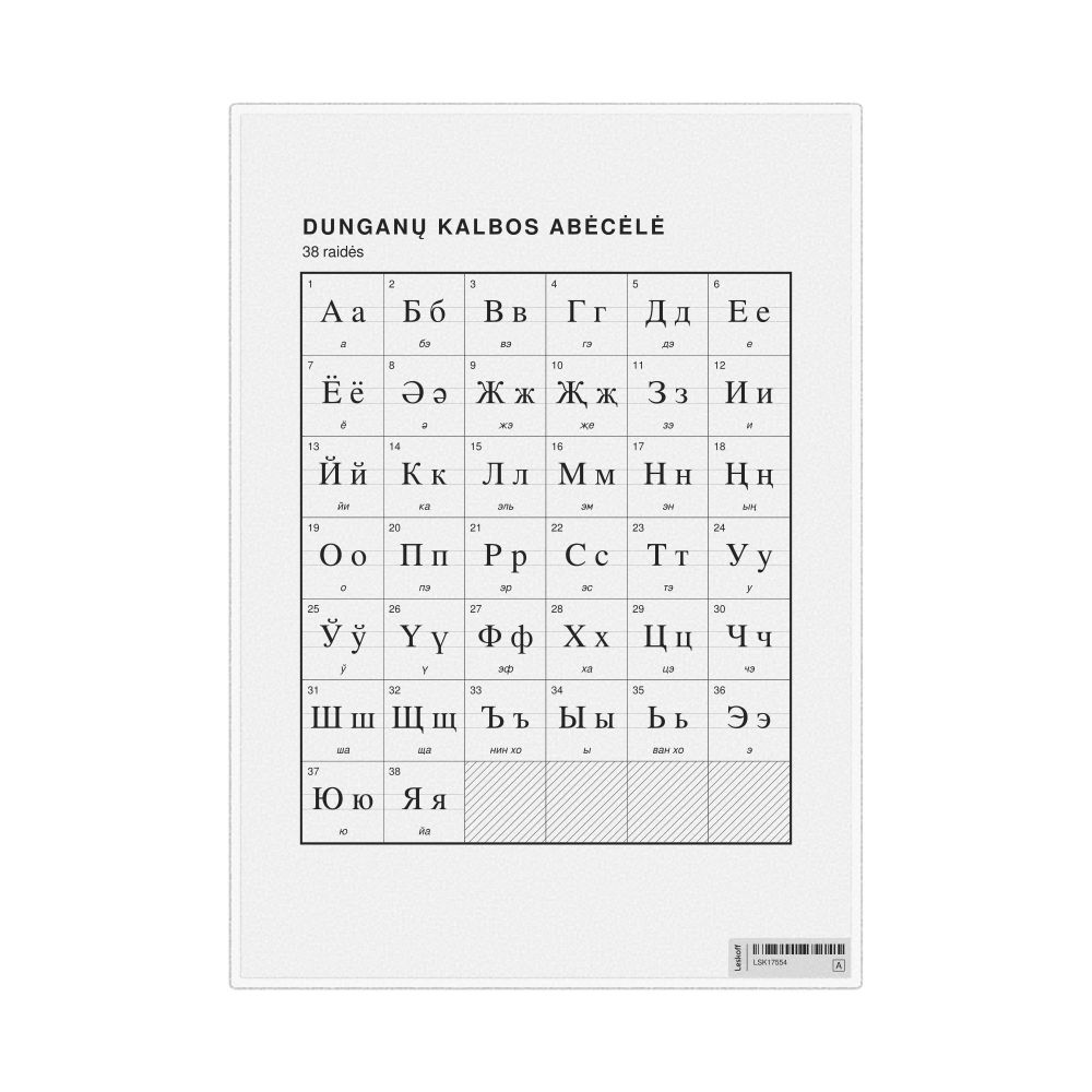 The Dungan alphabet chart (the full set of letters) labeled in Lithuanian (Dunganų kalbos abėcėlė) in the 8.3 x 11.7 in (21.0 x 29.7 cm, desk chart, laminated) format.