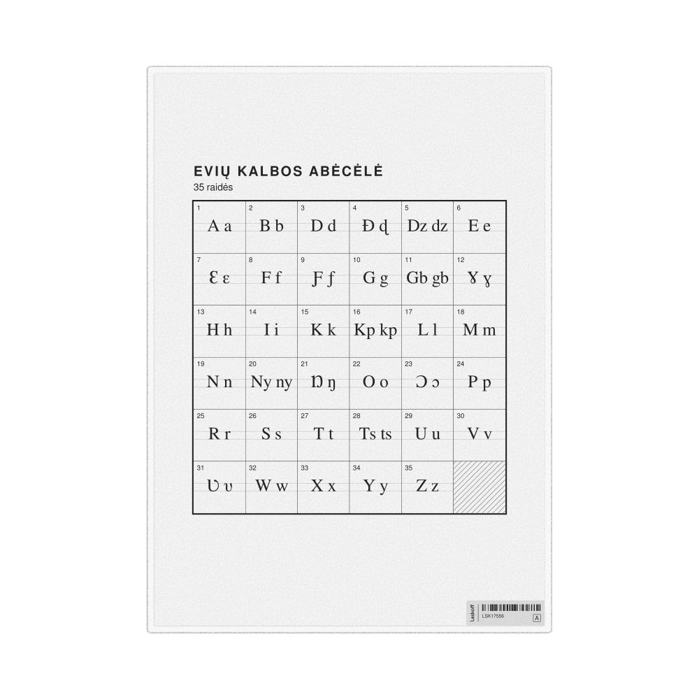 The Ewe alphabet chart (the full set of letters) labeled in Lithuanian (Evių kalbos abėcėlė) in the 8.3 x 11.7 in (21.0 x 29.7 cm, desk chart, laminated) format.