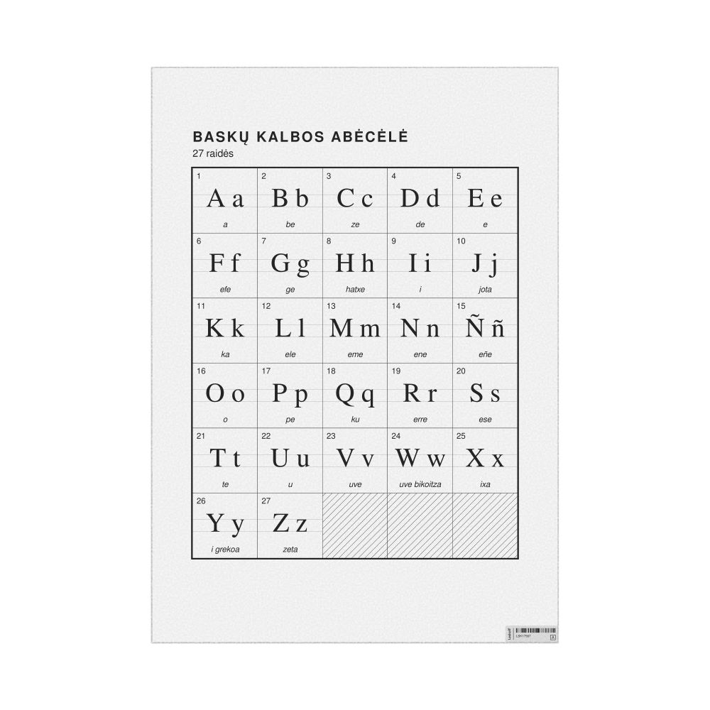 The Basque alphabet chart (the full set of letters) labeled in Lithuanian (Baskų kalbos abėcėlė) in the 23.4 x 33.1 in (59.4 x 84.1 cm, poster / wall chart) format.