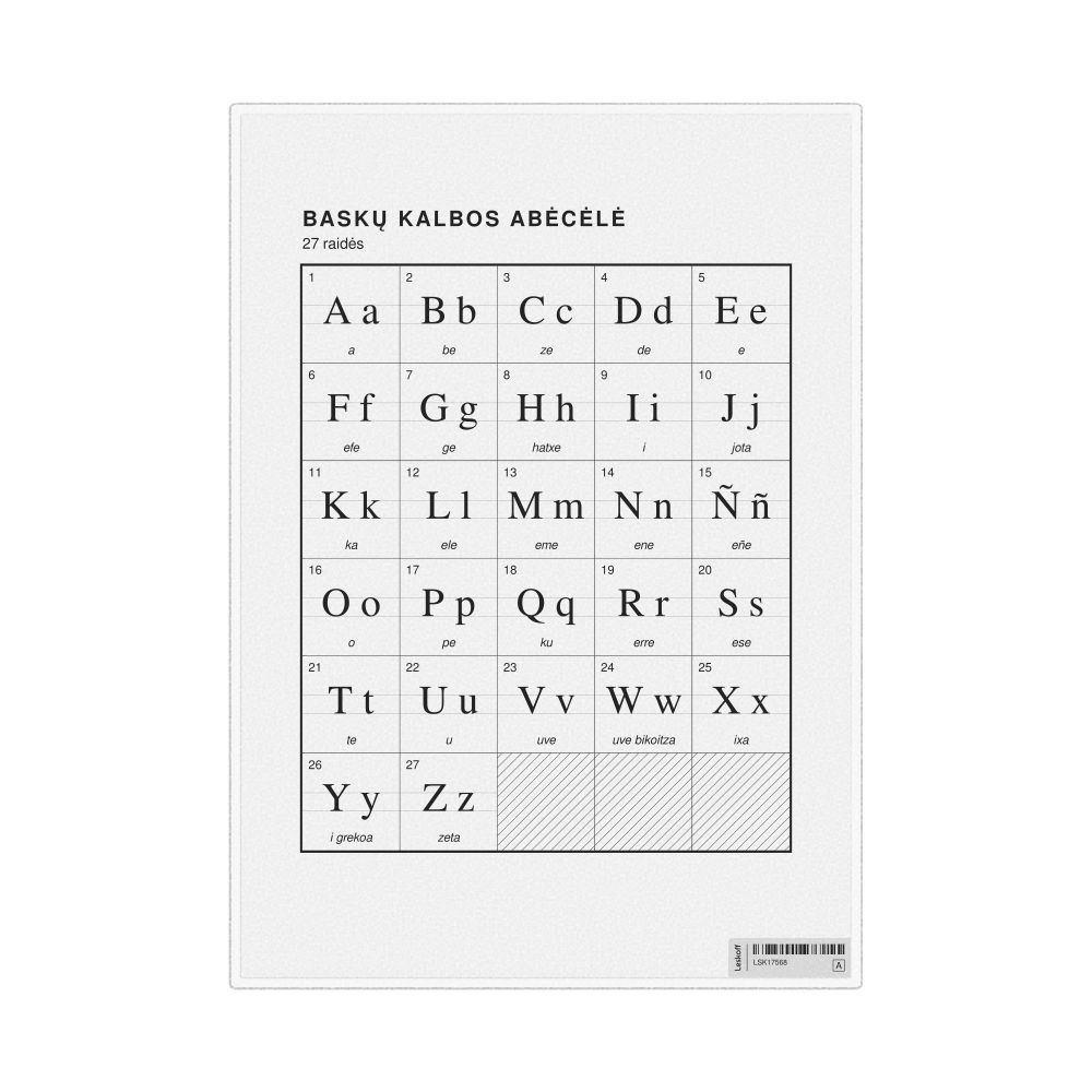 The Basque alphabet chart (the full set of letters) labeled in Lithuanian (Baskų kalbos abėcėlė) in the 8.3 x 11.7 in (21.0 x 29.7 cm, desk chart, laminated) format.