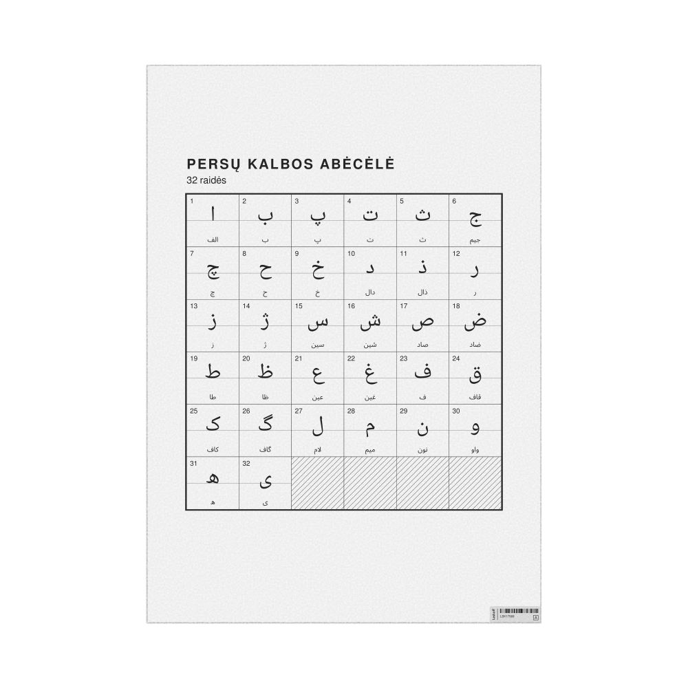 The Persian alphabet chart (the full set of letters) labeled in Lithuanian (Persų kalbos abėcėlė) in the 23.4 x 33.1 in (59.4 x 84.1 cm, poster / wall chart) format.