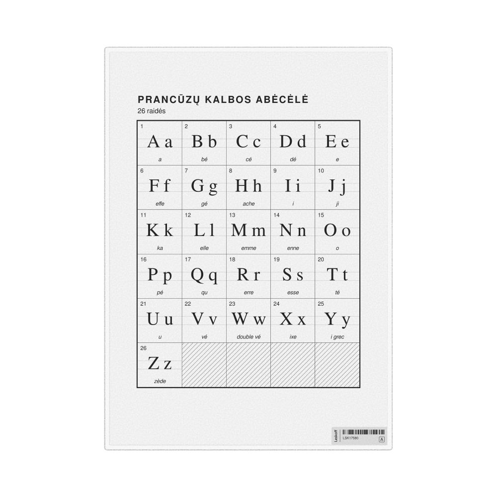 The French alphabet chart (the full set of letters) labeled in Lithuanian (Prancūzų kalbos abėcėlė) in the 8.3 x 11.7 in (21.0 x 29.7 cm, desk chart, laminated) format.