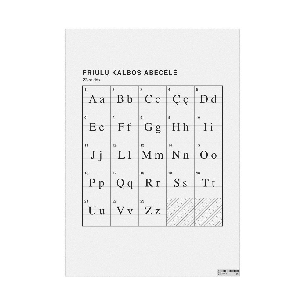 The Friulian alphabet chart with Lithuanian metatext.