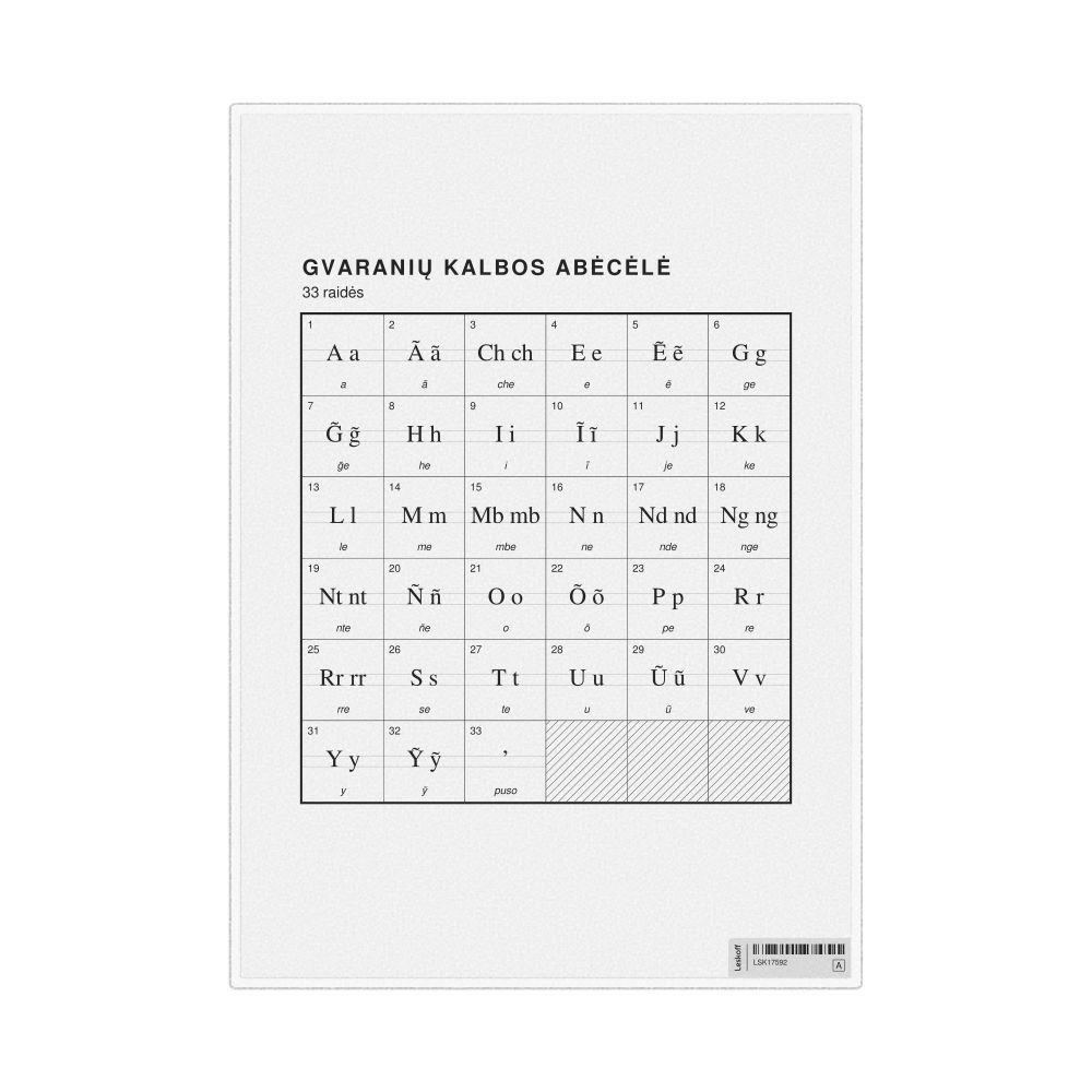 The Guarani alphabet chart (the full set of letters) labeled in Lithuanian (Gvaranių kalbos abėcėlė) in the 8.3 x 11.7 in (21.0 x 29.7 cm, desk chart, laminated) format.
