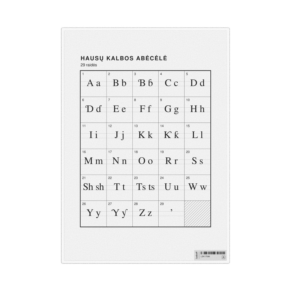 The Hausa alphabet chart (the full set of letters) labeled in Lithuanian (Hausų kalbos abėcėlė) in the 8.3 x 11.7 in (21.0 x 29.7 cm, desk chart, laminated) format.