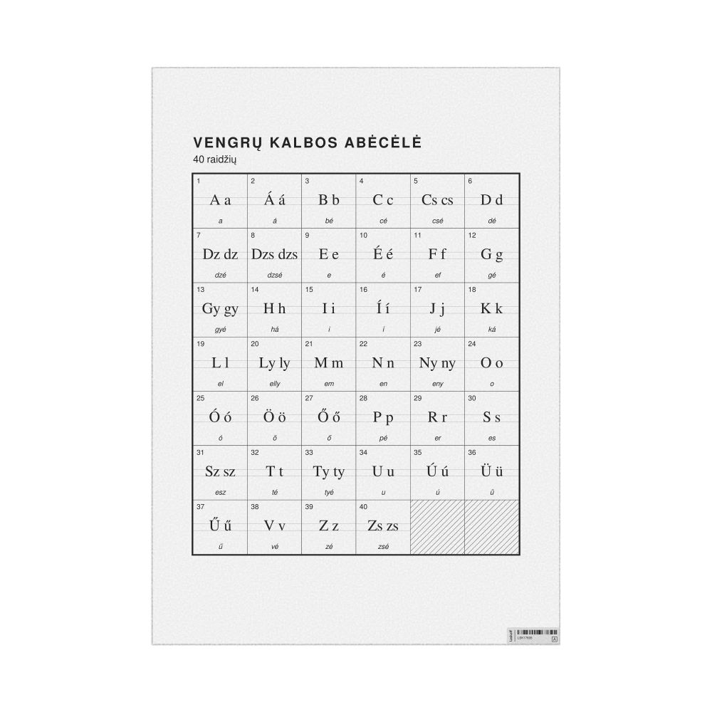 The Hungarian alphabet chart (the full set of letters) labeled in Lithuanian (Vengrų kalbos abėcėlė) in the 23.4 x 33.1 in (59.4 x 84.1 cm, poster / wall chart) format.
