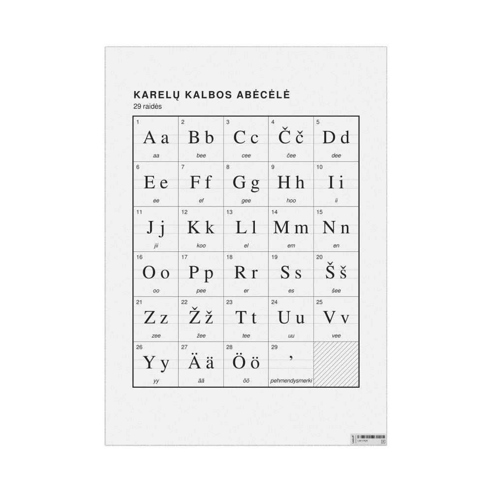 The Karelian alphabet chart (the full set of letters) labeled in Lithuanian (Karelų kalbos abėcėlė) in the 23.4 x 33.1 in (59.4 x 84.1 cm, poster / wall chart) format.