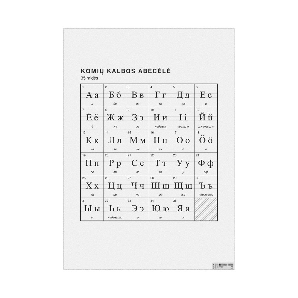 The Komi alphabet chart (the full set of letters) labeled in Lithuanian (Komių kalbos abėcėlė) in the 23.4 x 33.1 in (59.4 x 84.1 cm, poster / wall chart) format.