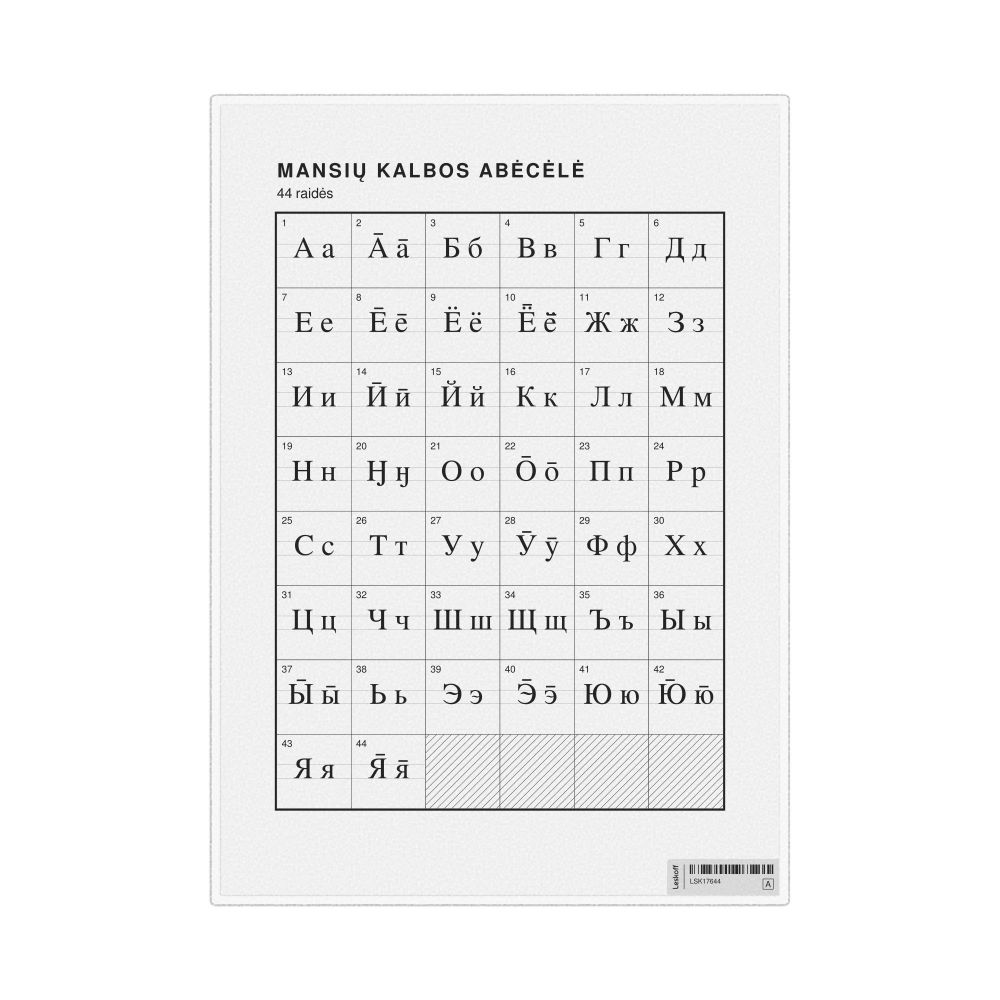 The Mansi alphabet chart (the full set of letters) labeled in Lithuanian (Mansių kalbos abėcėlė) in the 8.3 x 11.7 in (21.0 x 29.7 cm, desk chart, laminated) format.