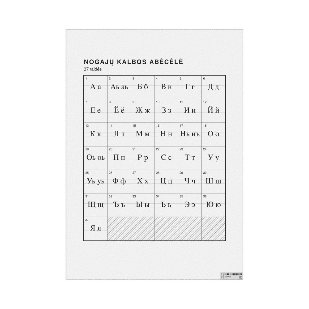 The Nogai alphabet chart (the full set of letters) labeled in Lithuanian (Nogajų kalbos abėcėlė) in the 23.4 x 33.1 in (59.4 x 84.1 cm, poster / wall chart) format.