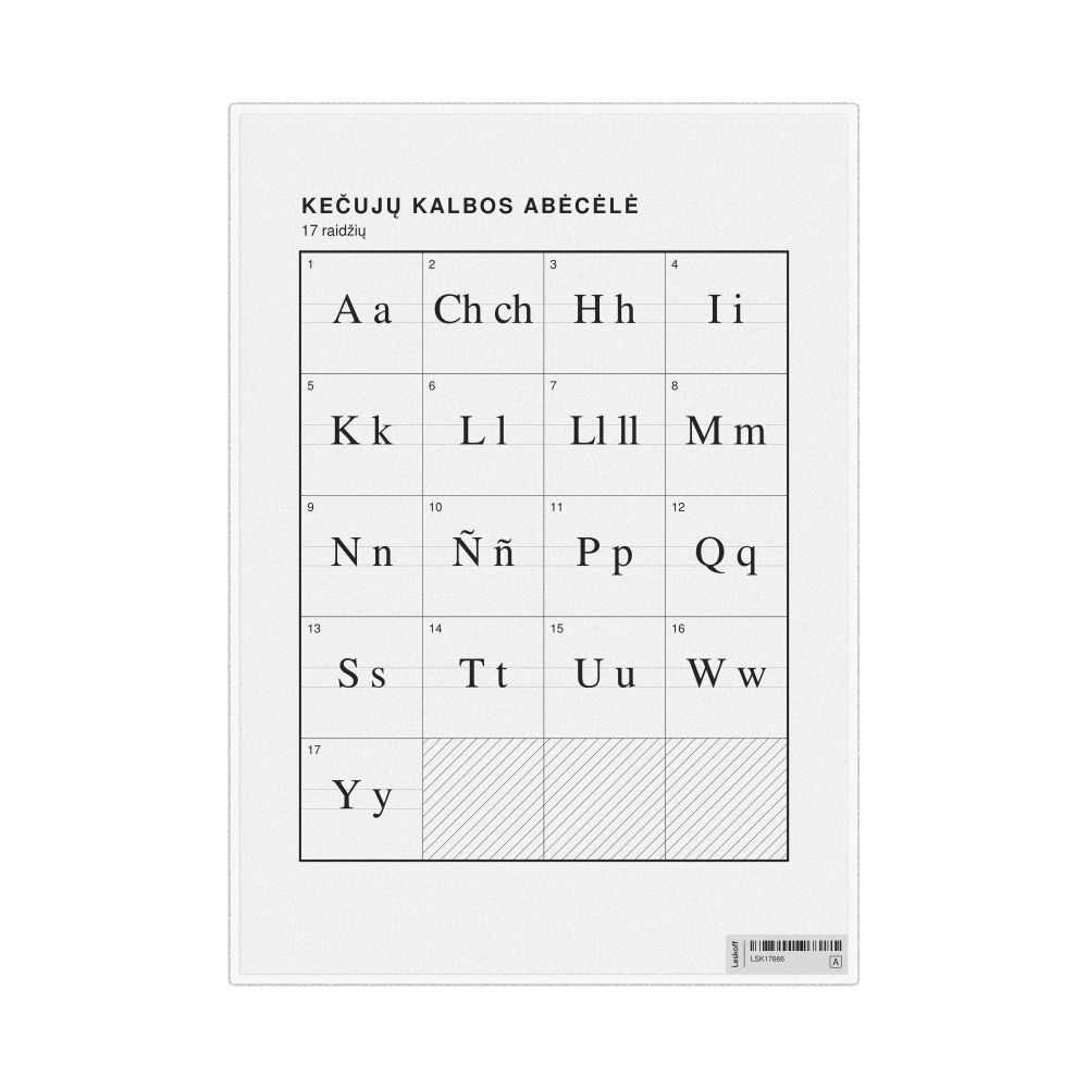 The Quechua alphabet chart (the full set of letters) labeled in Lithuanian (Kečujų kalbos abėcėlė) in the 8.3 x 11.7 in (21.0 x 29.7 cm, desk chart, laminated) format.