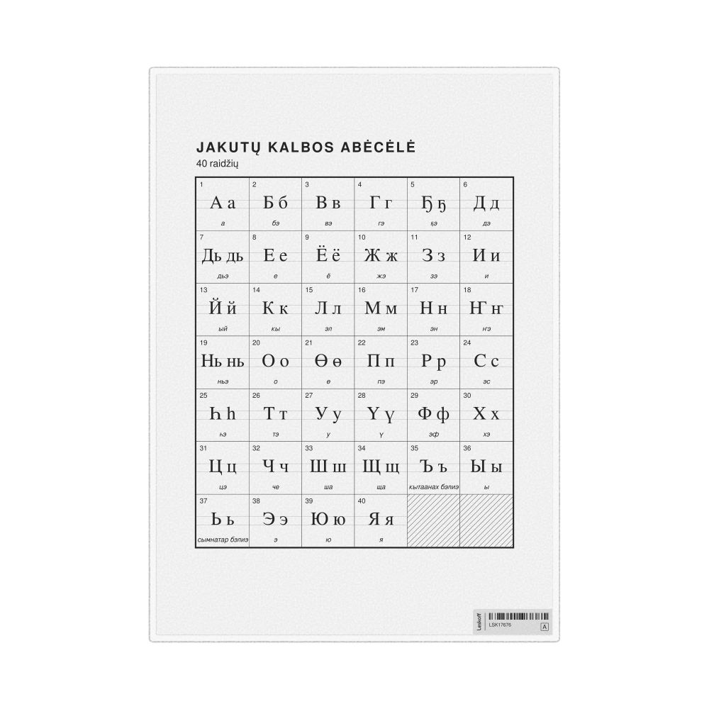The Yakut alphabet chart (the full set of letters) labeled in Lithuanian (Jakutų kalbos abėcėlė) in the 8.3 x 11.7 in (21.0 x 29.7 cm, desk chart, laminated) format.