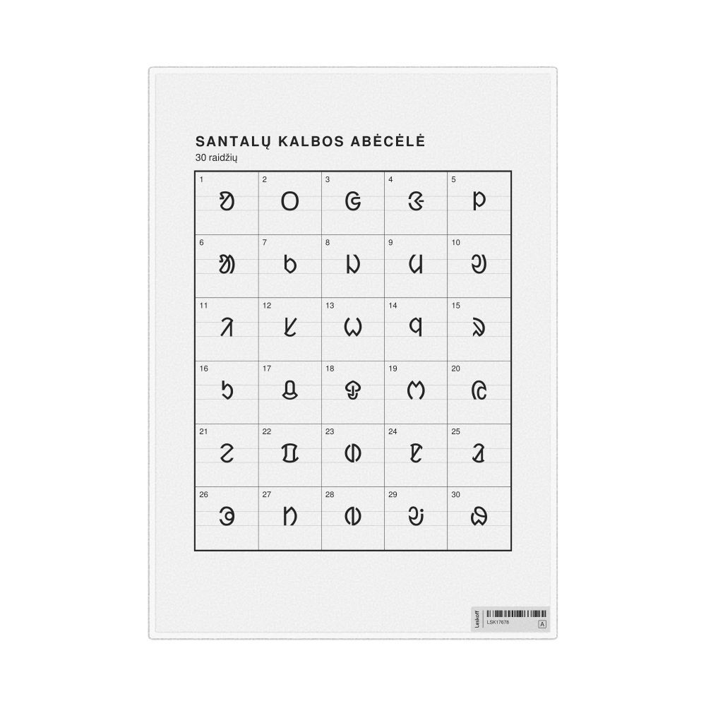 The Santali alphabet chart (the full set of letters) labeled in Lithuanian (Santalų kalbos abėcėlė) in the 8.3 x 11.7 in (21.0 x 29.7 cm, desk chart, laminated) format.