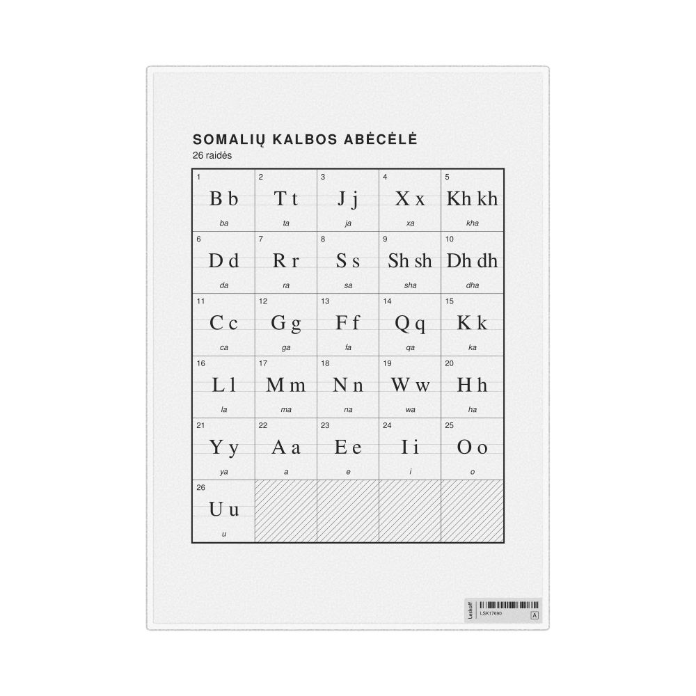The Somali alphabet chart (the full set of letters) labeled in Lithuanian (Somalių kalbos abėcėlė) in the 8.3 x 11.7 in (21.0 x 29.7 cm, desk chart, laminated) format.