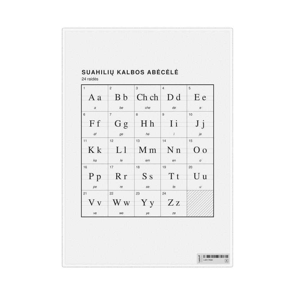 The Swahili alphabet chart (the full set of letters) labeled in Lithuanian (Suahilių kalbos abėcėlė) in the 8.3 x 11.7 in (21.0 x 29.7 cm, desk chart, laminated) format.