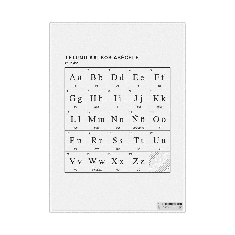 The Tetum alphabet chart (the full set of letters) labeled in Lithuanian (Tetumų kalbos abėcėlė) in the 8.3 x 11.7 in (21.0 x 29.7 cm, desk chart, laminated) format.
