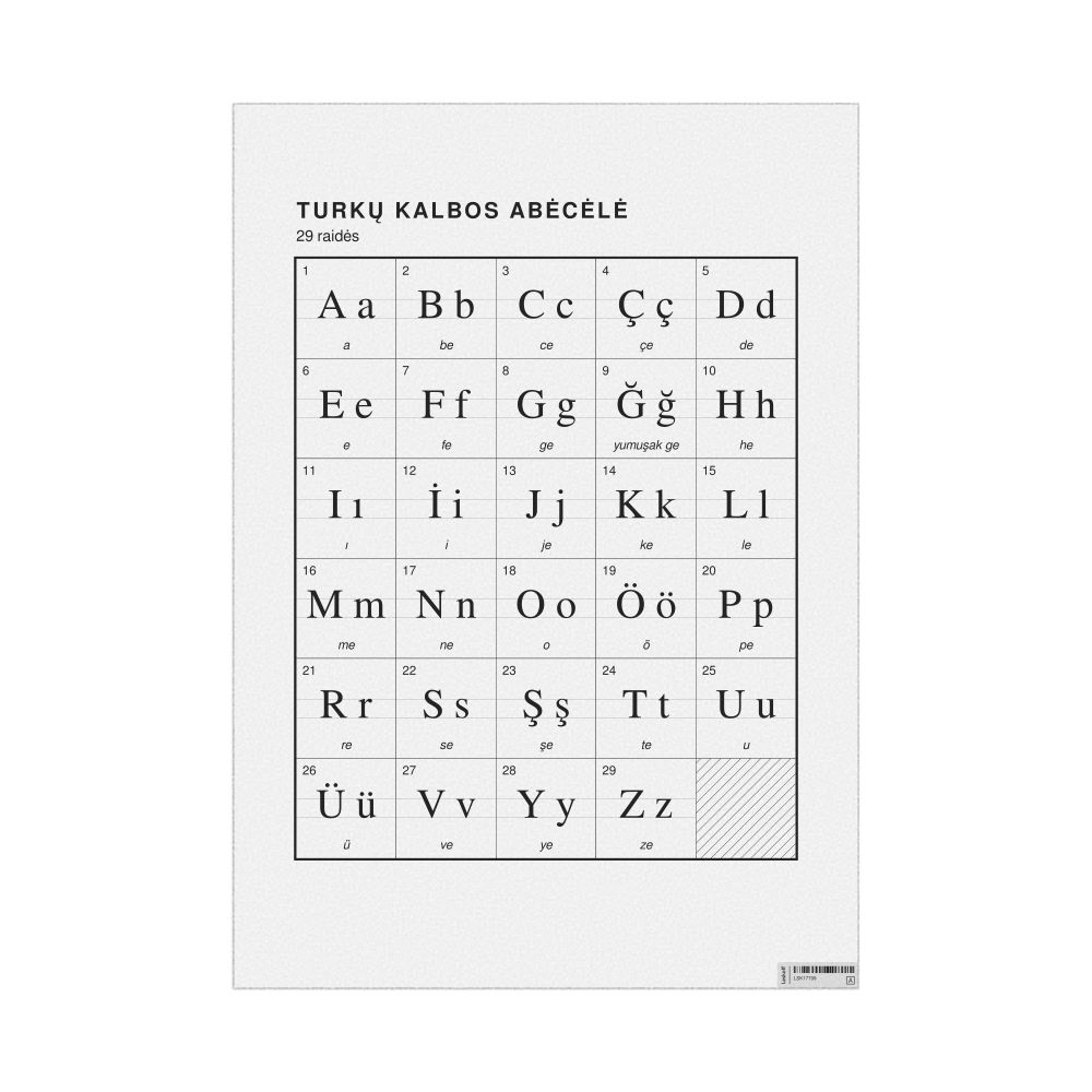 The Turkish alphabet chart (the full set of letters) labeled in Lithuanian (Turkų kalbos abėcėlė) in the 23.4 x 33.1 in (59.4 x 84.1 cm, poster / wall chart) format.